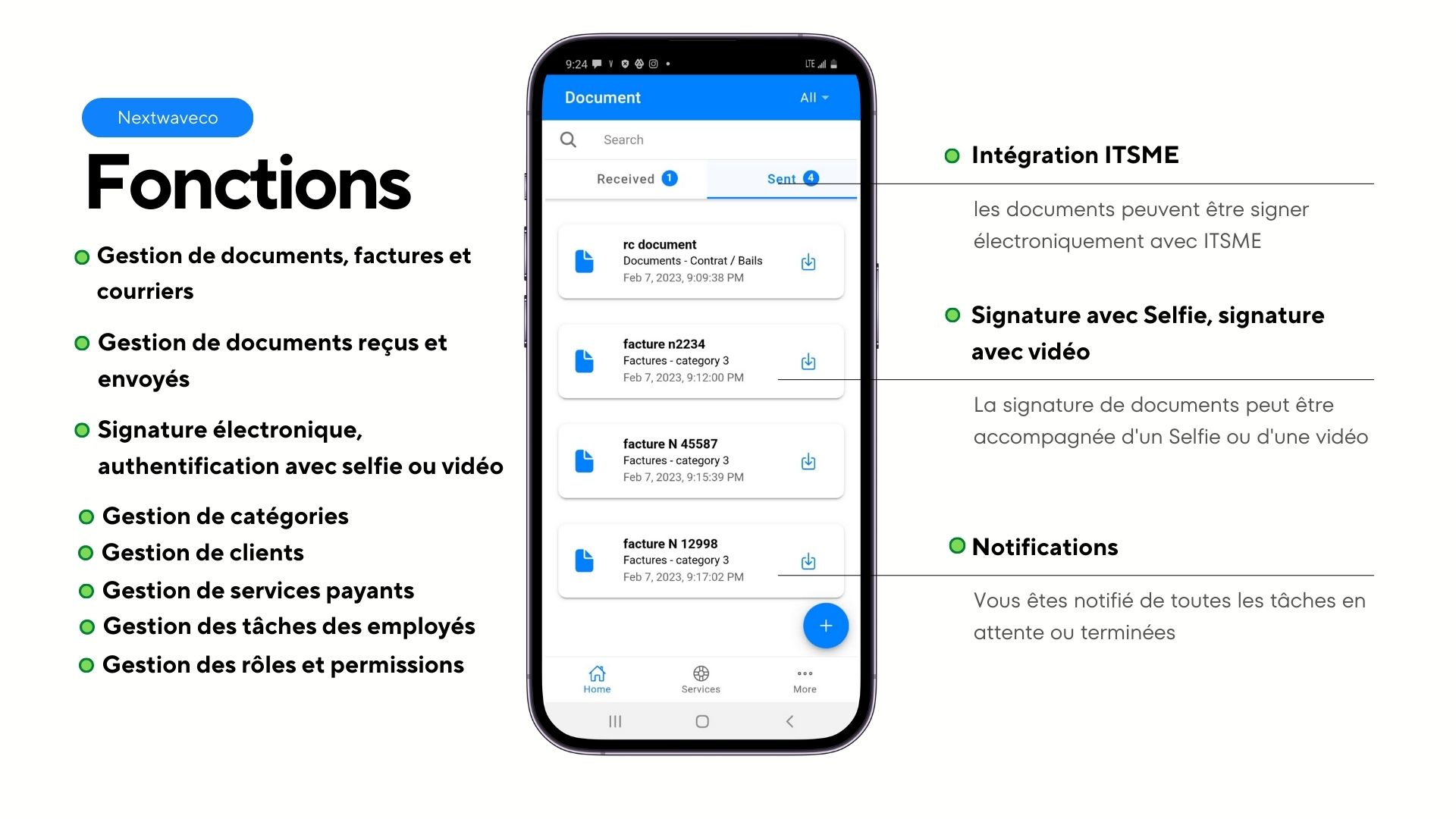 Grâce à cette application, tous les documents administratifs, les courriers et les factures sont stockés dans votre base de donnée sécurisé. Vos clients y sont archivés avec des profils complets. Les documents peuvent être signés avec une signature électronique ou avec une authentifiction par Selfie ou vidéo.