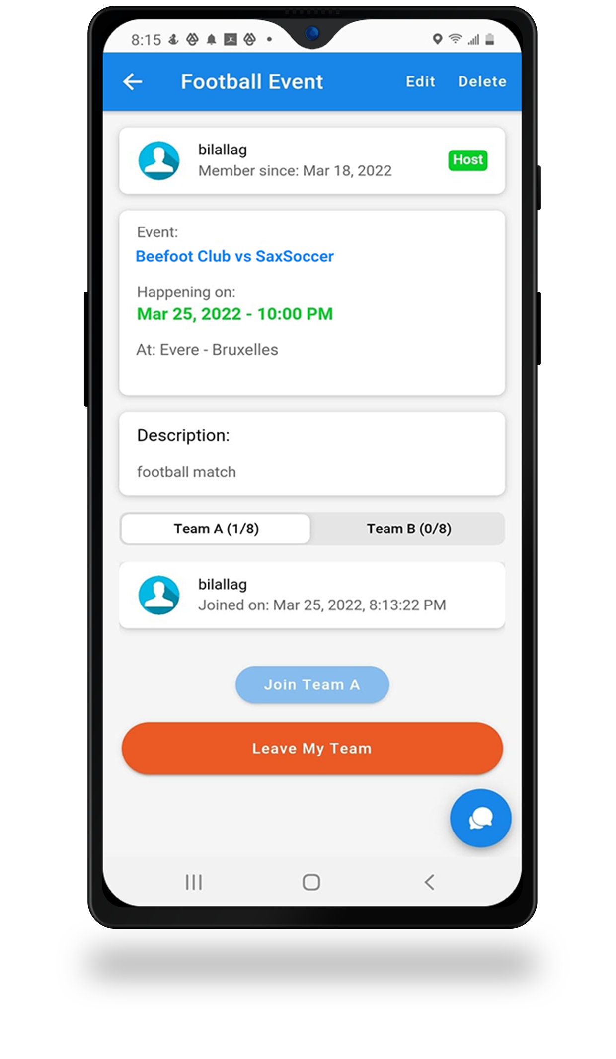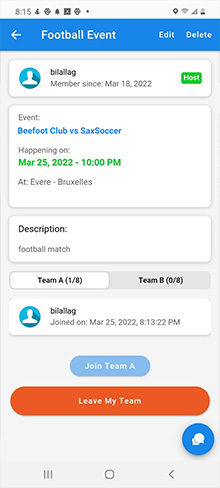 Les joueurs peuvent chater entre eux via l'application, en participant à un évènement, afin de se mettre d'accord sur les modalités et sur le déroulement du match à venir.